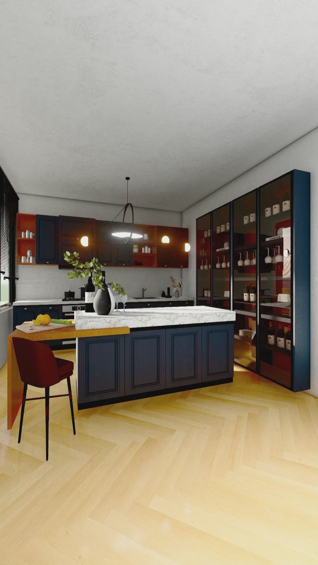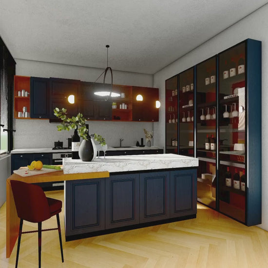 A minimalist kitchen, designed to inspire 🤩Bold black and deep red cabinetry contrast with a sleek marble island and breakfast bar, while warm wood flooring and soft lighting add a touch of sophistication.📍 Kitchen of Crystal Cube