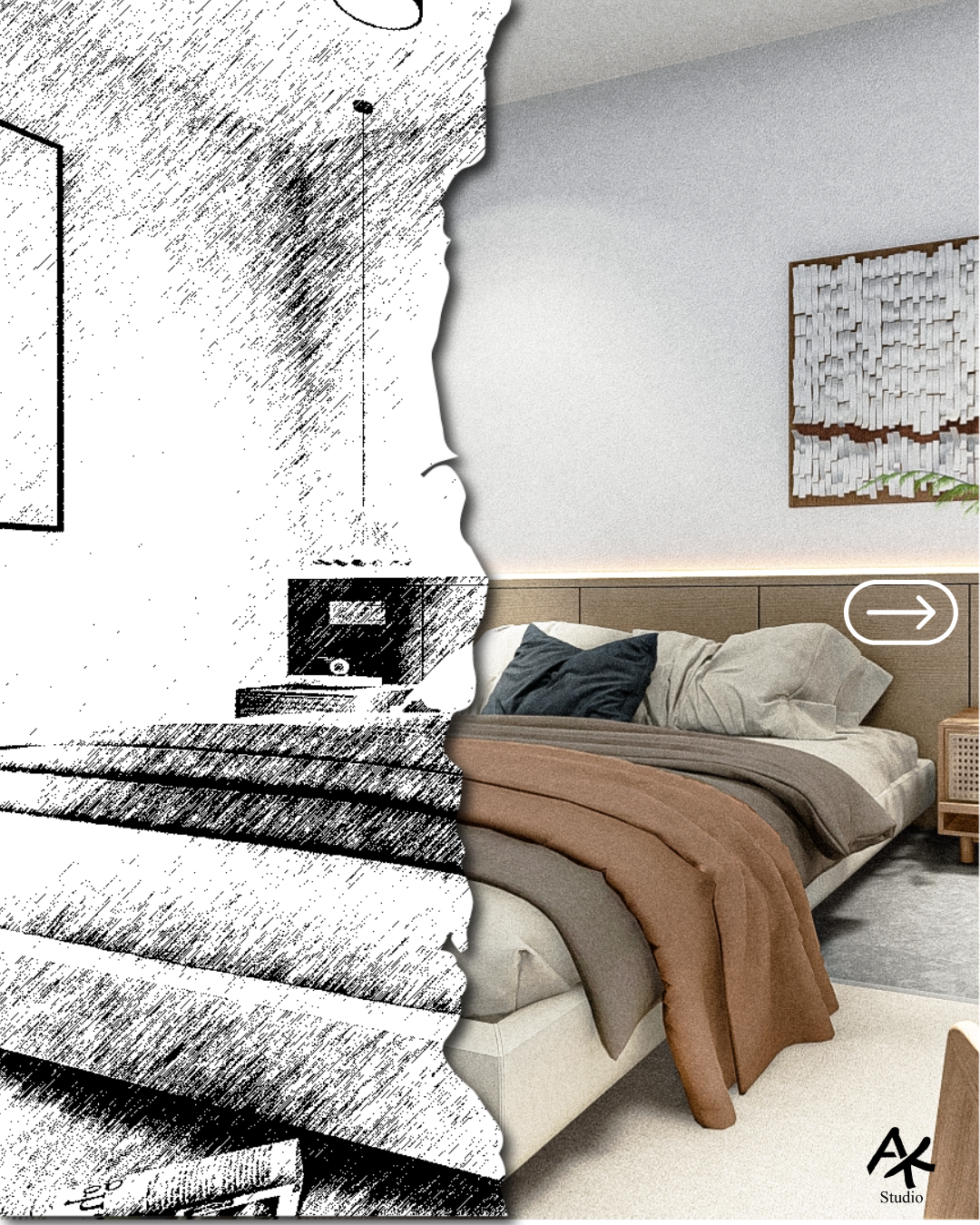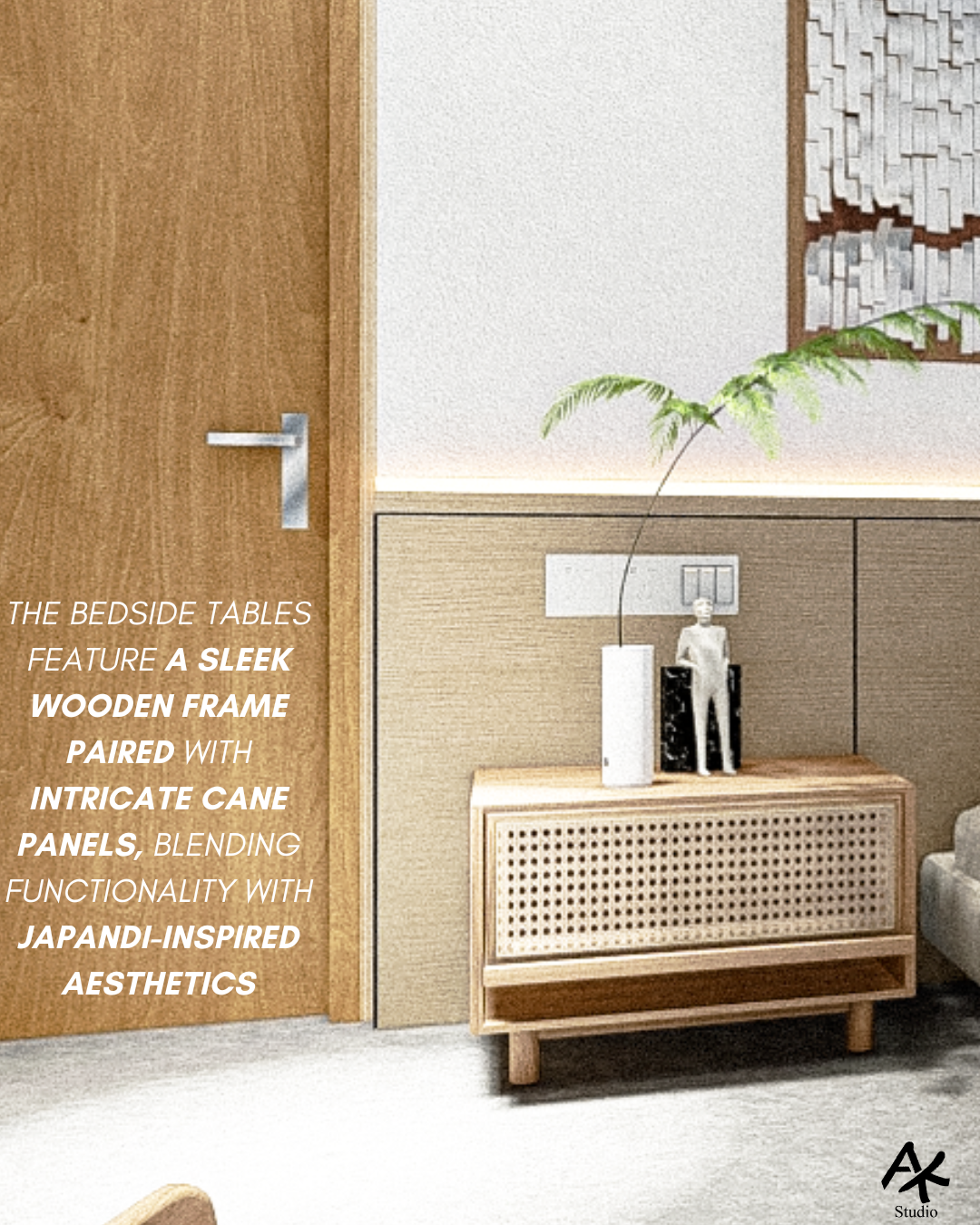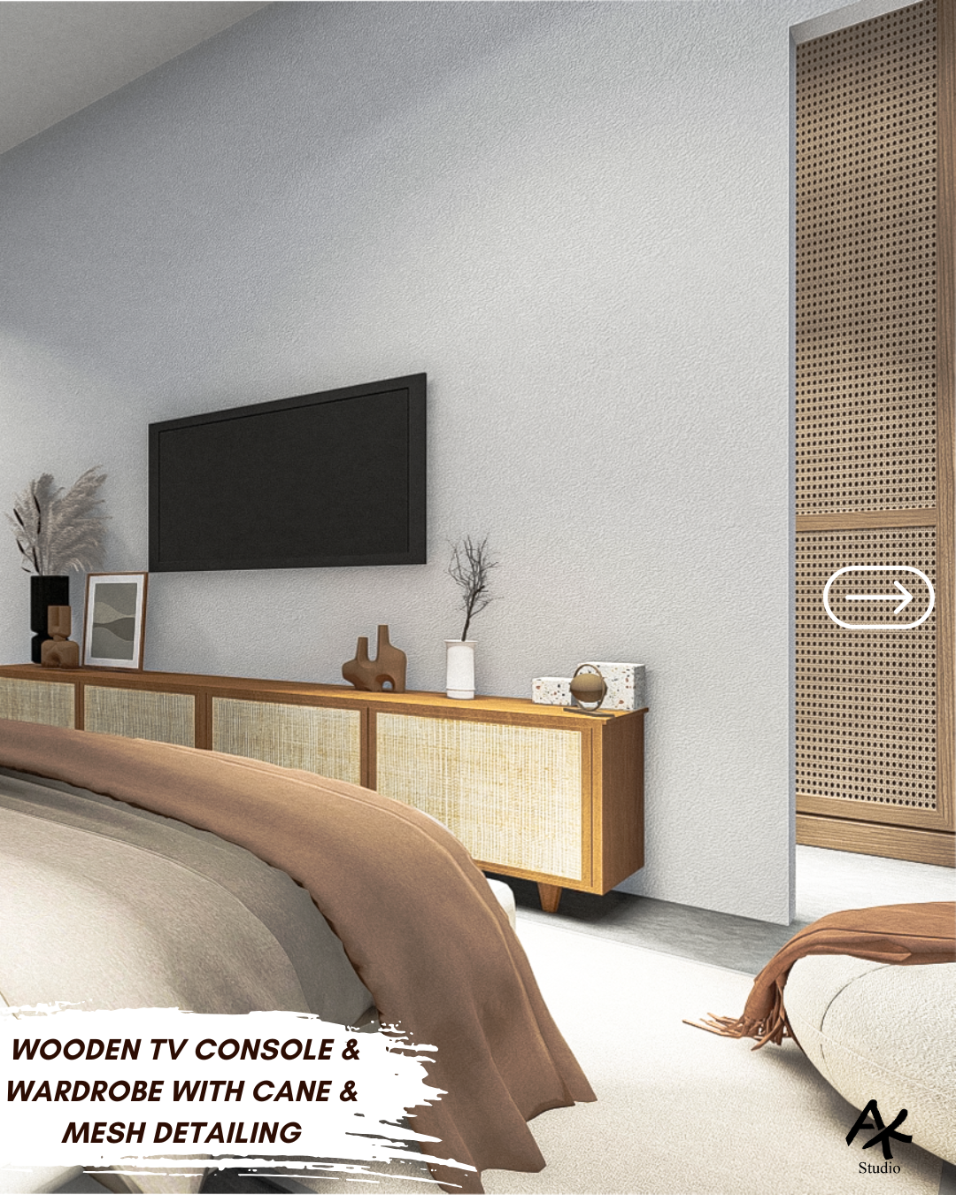 Crafting bedroom serenity with natural elements - custom wooden wardrobes adorned with delicate cane details, and minimalist bedside tables that blend function with form.