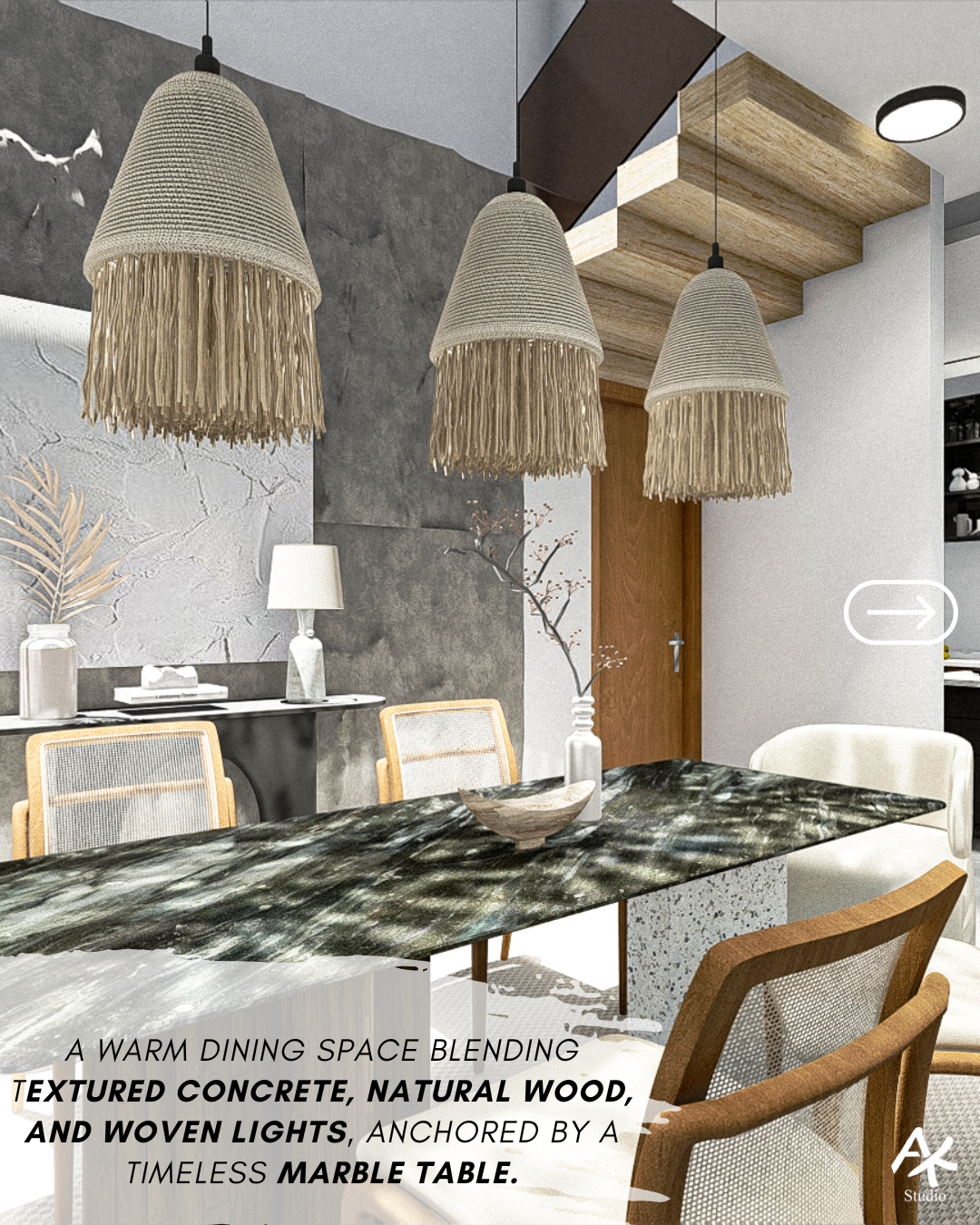 Terra Nova: Raw meets Refined ✨Concrete walls meet woven textures in this contemporary dining space. Natural rope lights cascade over a marble centerpiece, while cane chairs add warmth to cool modernism. A perfect harmony of organic and structured design.